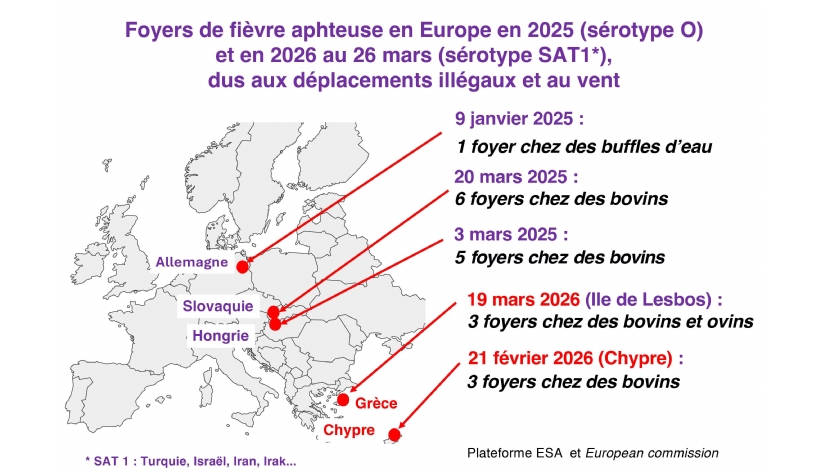 En 2026, une nouvelle épizootie de fièvre aphteuse a été déclarée le 19 février dans la partie turque de l'île de Chypre, qui s'est répandue dans le reste de l'île. Puis un premier foyer grec a été confirmé le 17 mars dans un élevage mixte de bovins et ov...