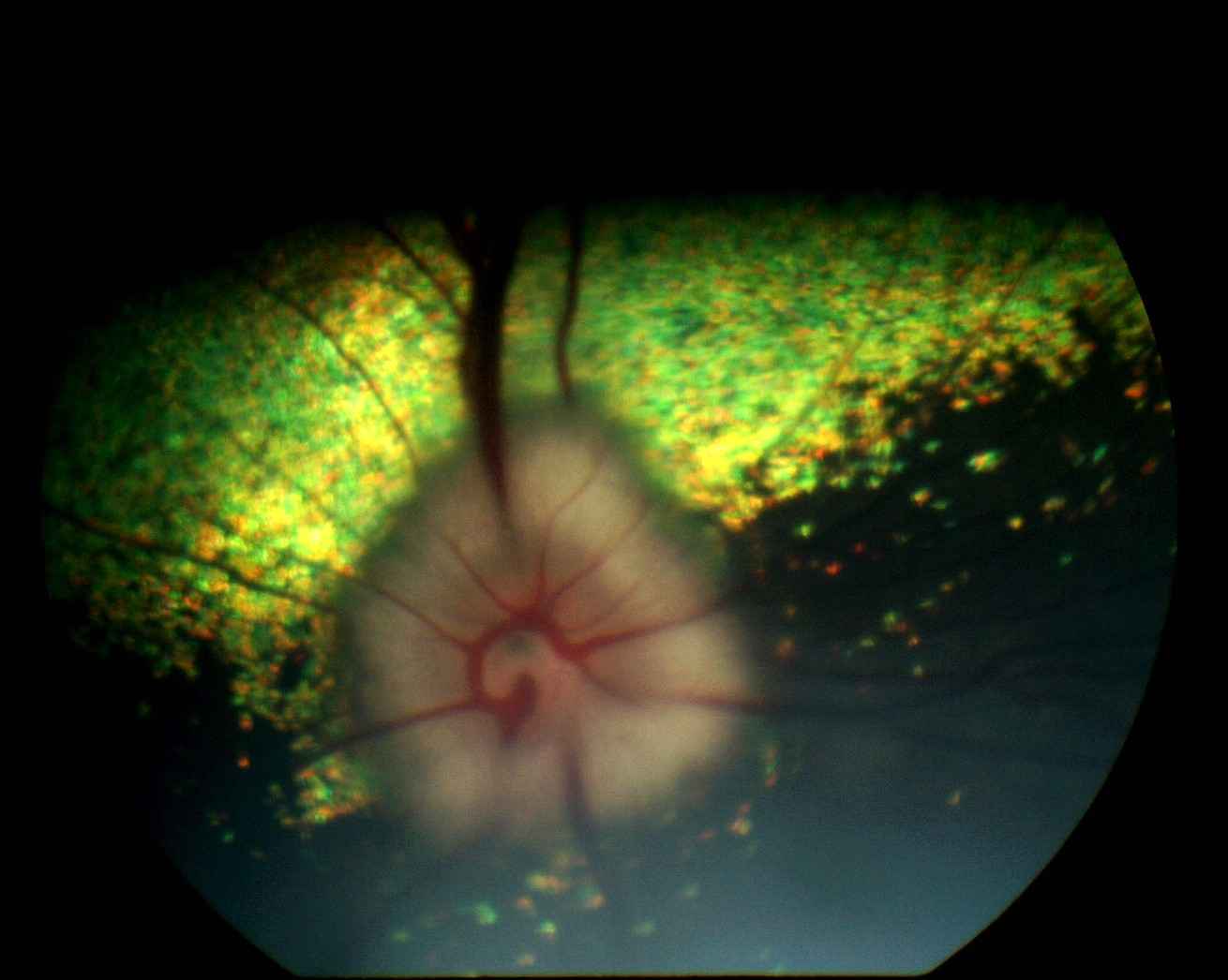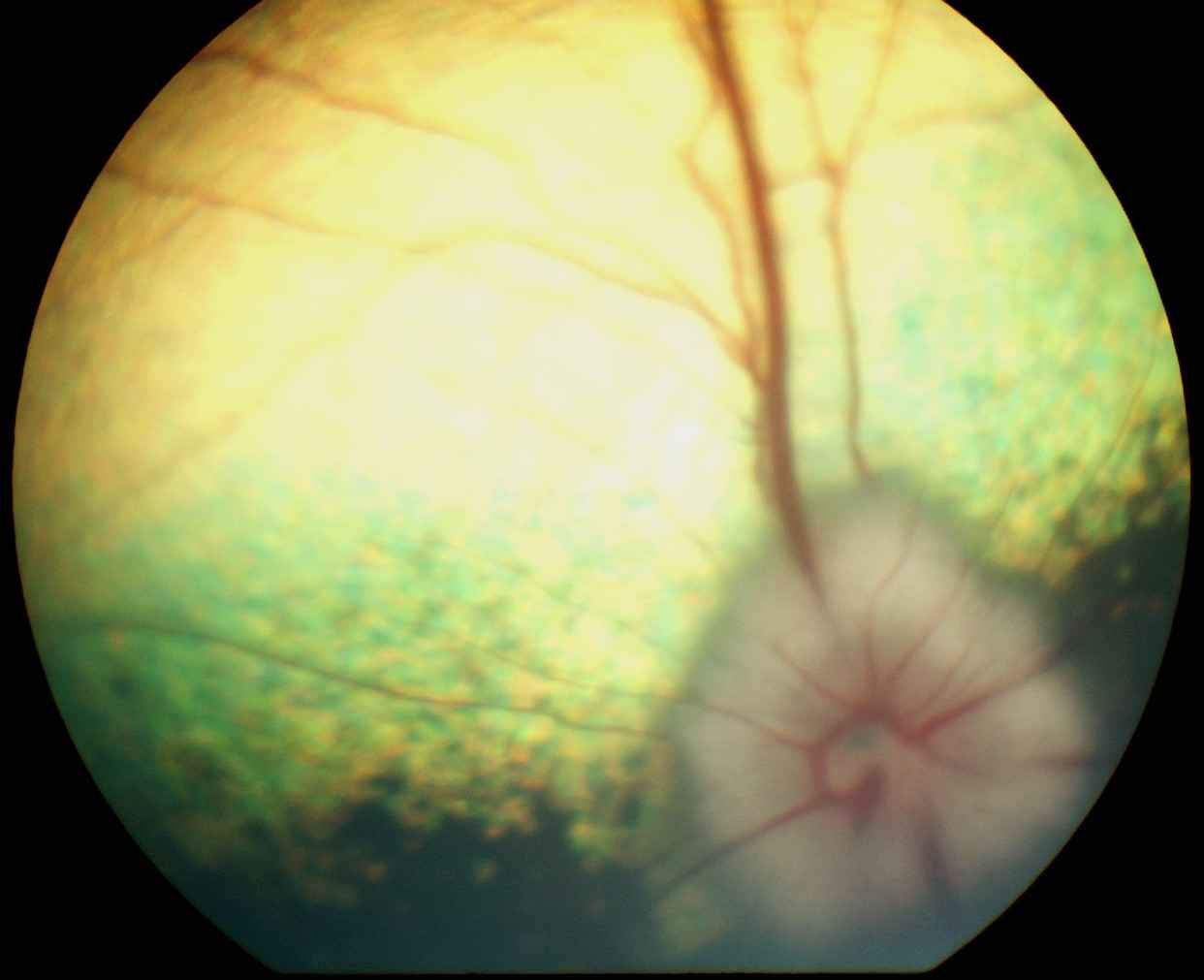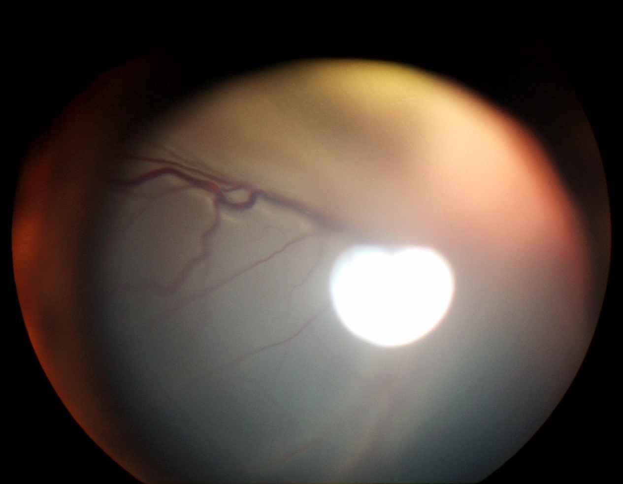 La neurorétine, translucide, est totalement décollée à droite et à gauche, sans qu'aucune partie de tapis choroïdien ou de zone sans tapis ne soit directement visible, ce qui est en faveur d'une absence de déchirure (trou rétinien).