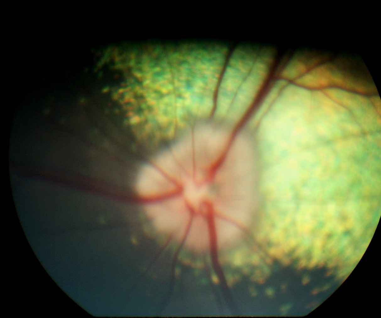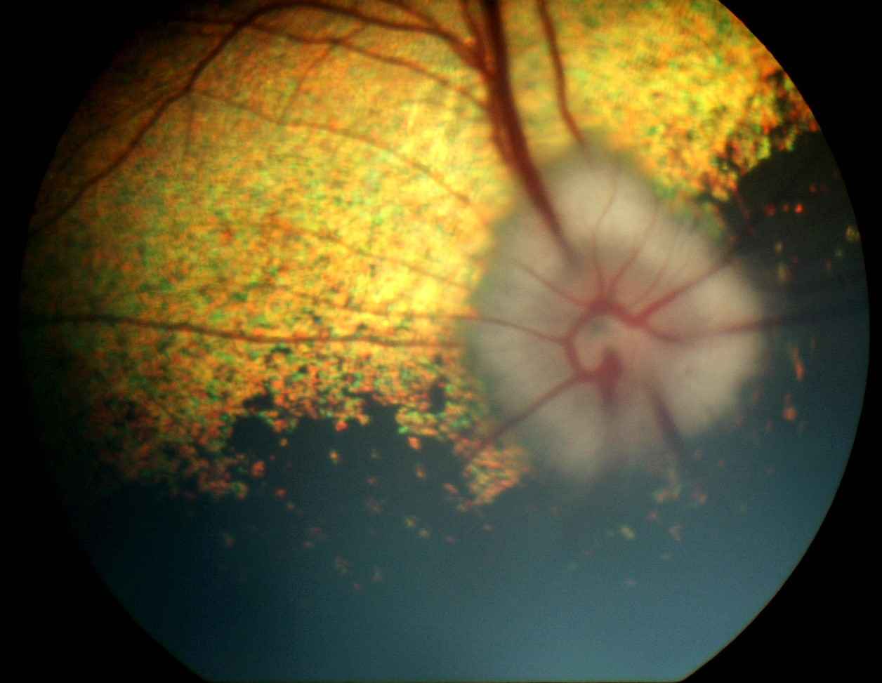 Les aires pupillaires apparaissent totalement occupées par un voile grisâtre translucide, d'aspect mamelonné, au sein duquel des vaisseaux sanguins aux contours nets sont remarqués. Les cristallins sont en place et transparents. Les zones du tapis (jaune orangé) et sans tapis (sombre) du fond d'oeil sont identifiables mais floues à droite et à gauche (photos n° 1A et 1B).