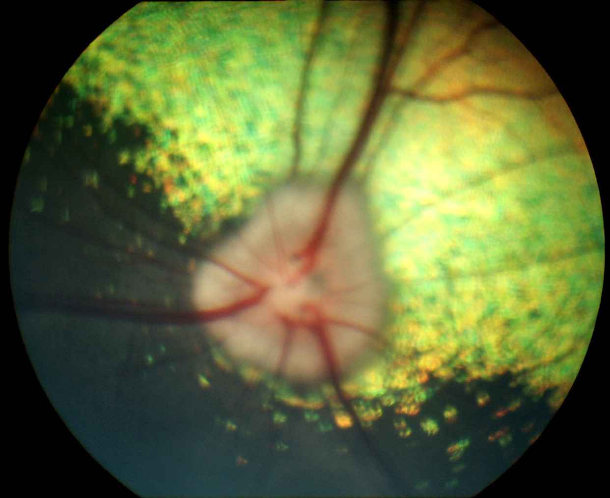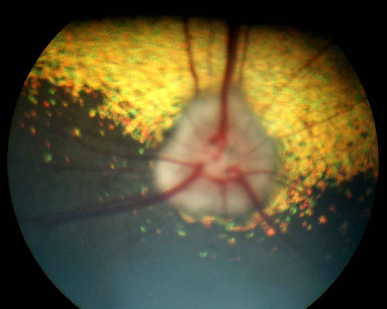 Photo n° 1A : OEil droit : aspect mamelonné et reflet de la zone sans tapis bien visibles.