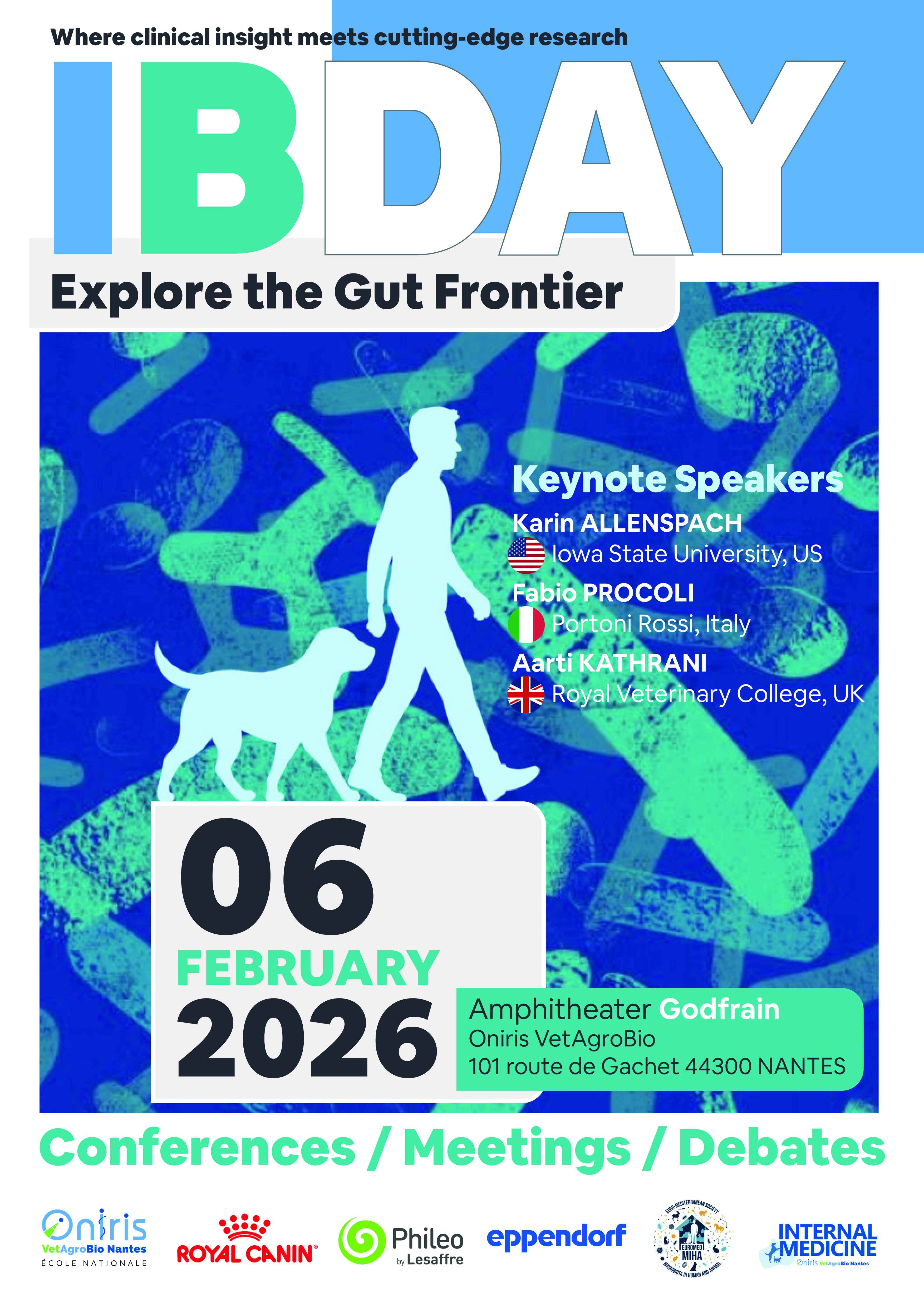 IBDay, journée dédiée aux récentes avancées en matière d'inflammation intestinale chronique et de modulation du microbiote chez l'Homme et le chien, organisée par la Centre hospitalier universitaire vétérinaire d'Oniris, se tiendra dans l'amphithéâtre Godfrain de l'école, le 6 février*.