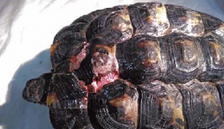 Les fractures de carapace sont une dominante pathologique chez les tortues captives et sauvages. Les causes les plus fréquentes sont l'accident de tondeuse, la morsure de chien, l'accident de voiture (notamment chez les tortues sauvages) et la chute.