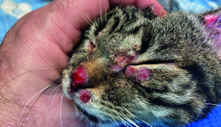Photo n° 1 : Nodules érythémateux et ulcérés de la face chez un chat atteint de poxvirose.