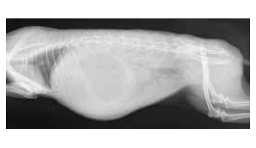 Mercredi 20 Mars 2024 Animaux de compagniePhoto n° 1 : Radiographie de profil d'un lapin en occlusion : image caractéristique de l'estomac dite en oeuf au plat.