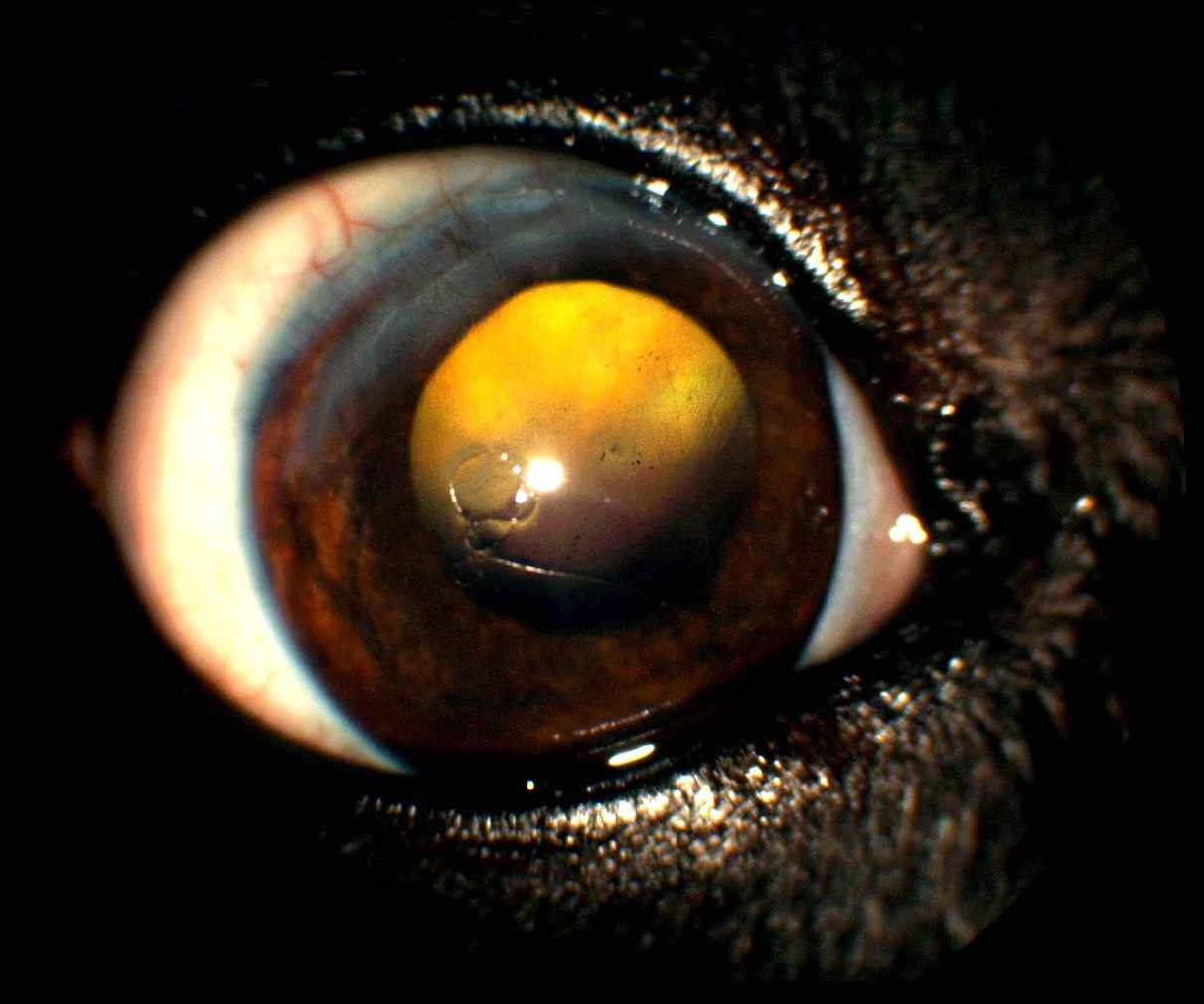 Par rapport à ses deux soeurs et ses deux frères, dont la transparence cornéenne est parfaite, une chienne présente un oedème cornéen central stromal profond plus dense à gauche qu'à droite (photos n° 1A et 1B), deux jours avant la consultation à droite et une semaine avant la consultation à gauche.
