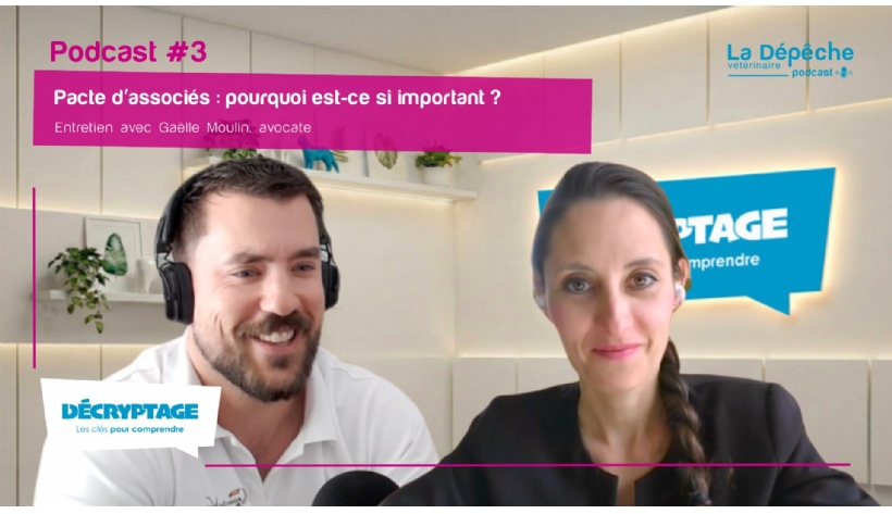 La Dépêche Vétérinaire a mis en ligne, le 10 avril, le troisième épisode de son podcast vidéo Décryptage Les clés pour comprendre. Intitulé Pacte d'associés : pourquoi est-ce si important ?, il accueille Gaëlle Moulin, avocate en droit des sociétés et cofondatrice du cabinet d'affaires Kiron Avocats, spécialisé dans l'accompagnement des professions libérales.