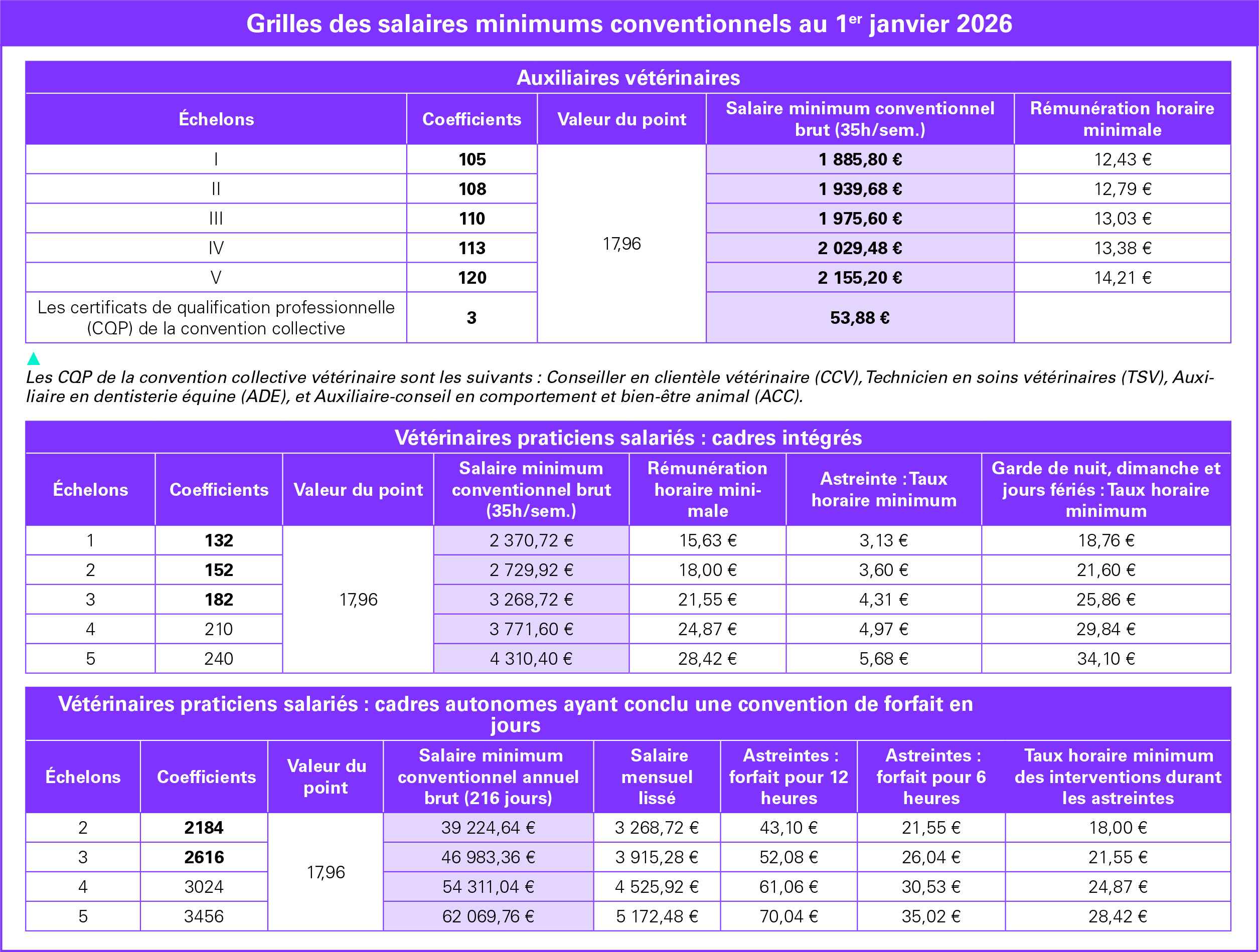 Cette augmentation porte, par exemple, le salaire minimum des auxiliaires au 5e échelon à 2 155,20 euros bruts et celui des vétérinaires au 4e échelon à 3 771,60 euros bruts (contrat heure).