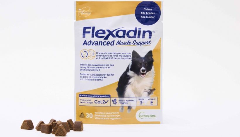 Flexadin® Advanced Muscle Support est un aliment complémentaire, fabriqué en France, présenté en sachet fraîcheur de 30 bouchées, spécialement formulé pour les chiens. Il aide à maintenir et à renforcer la masse musculaire et à préserver la flexibilité des articulations. ■
