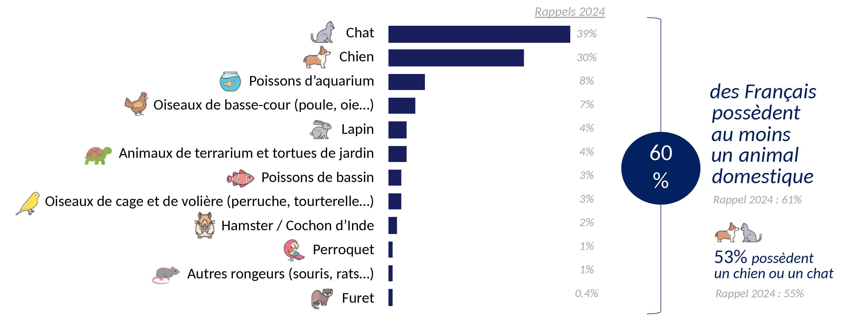 Six Français sur dix possèdent au moins un chien et/ou un chat, les chiens étant présents dans 29 % des foyers français et les chats dans 39 % des foyers. Ces proportions sont stables par rapport à l'an dernier (figure n° 1).