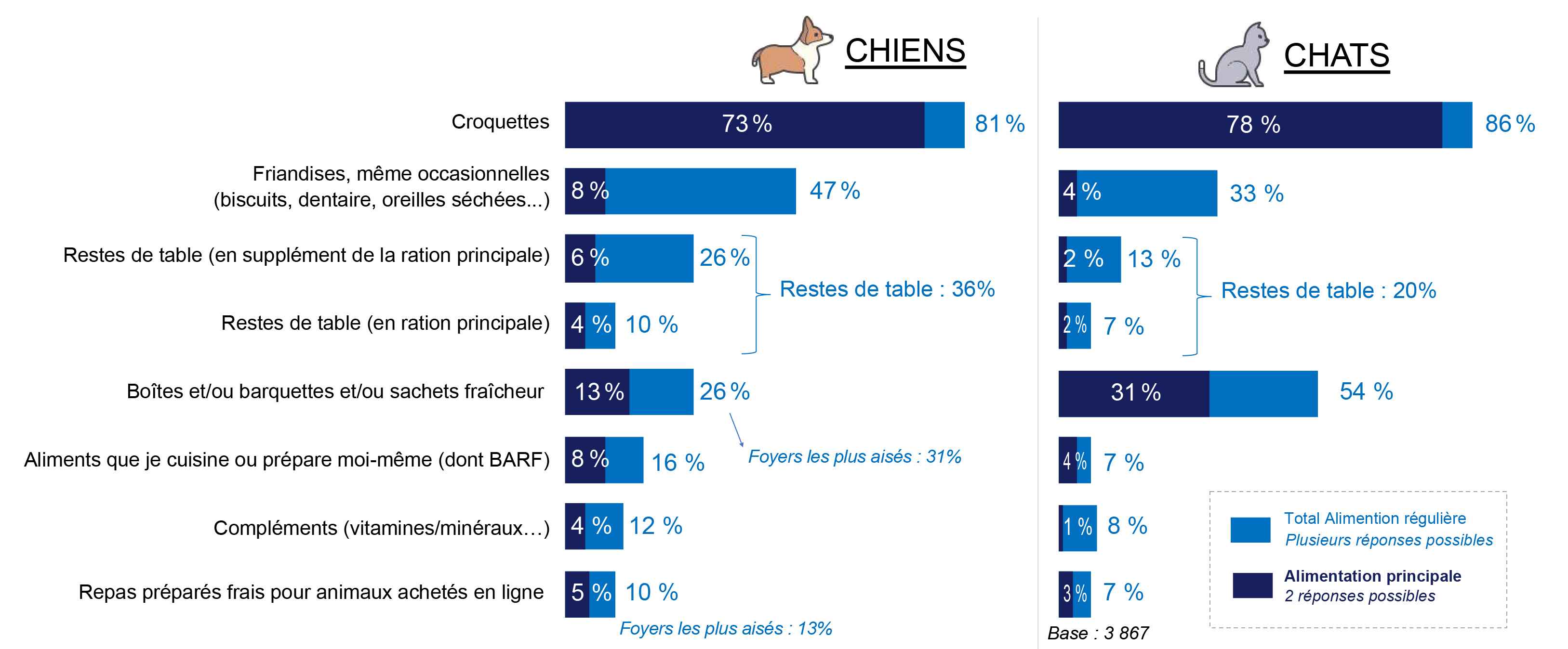 En moyenne, un propriétaire consacre au budget alimentaire 487 euros par an pour un chien et 324 euros pour un chat, montants qui connaissent de fortes disparités (un tiers des propriétaires de chiens consacre moins de 250 euros annuels à ce volet alimentaire quand 12 % y dédient plus de 1 000 euros) et sont en progression croissante avec le niveau de revenu.