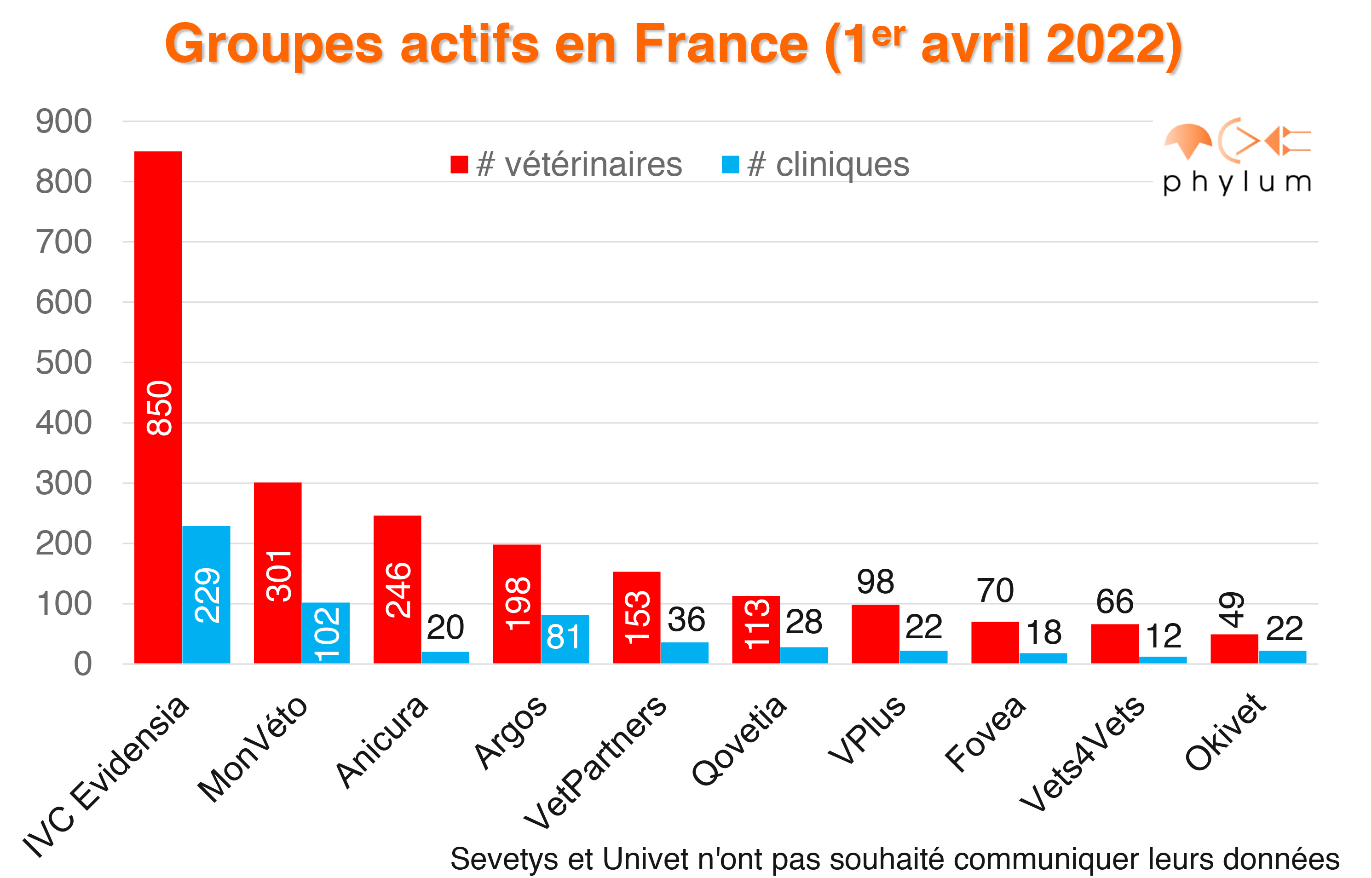 Au total, quelque 2 600 vétérinaires travaillent dans des groupes en France dans environ 700 établissements de soins vétérinaires, le groupe IVC Evidensa réunissant un tiers de ces vétérinaires à lui seul, MonVéto 12 % , Anicura 10 % (qui mise davantage sur les grosses structures) et les 9 autres, 45 %.