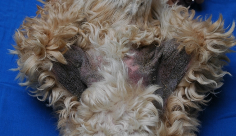 Cocker atopique avec surinfection par des levures (Malassezia). Le prurit est intense (évalué à 10/10 sur une échelle visuelle analogique). Les corticoïdes sont contre-indiqués. En complément du traitement antifongique, deux injections de lokivetmab sont réalisées à T0 et T0 + 1 mois.