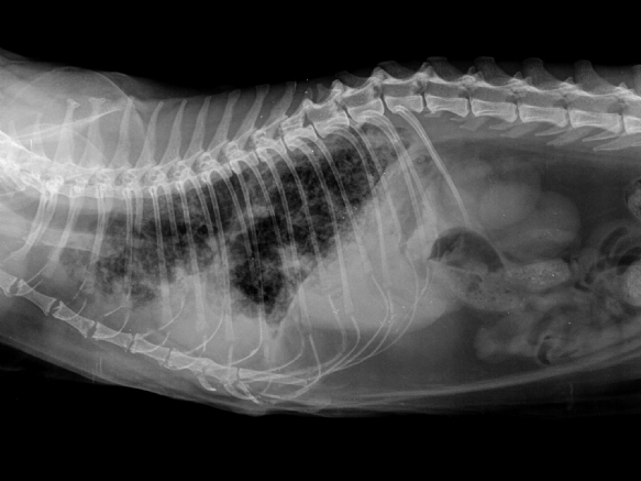 Mercredi 6 Janvier 2021 Animaux de compagnieRadiographie d'un profil métastatique d'un carcinome mammaire félin montrant des métastases de type miliaire (classique dans cette espèce) ainsi qu'un épanchement pleural (facteur de mauvais pronostic pour cette étude).