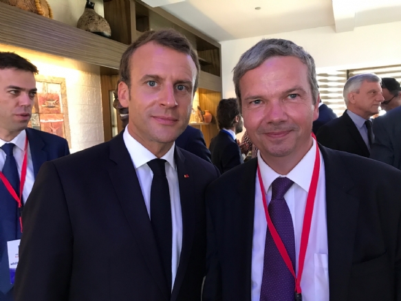 Mercredi 19 Septembre 2018 EntrepriseLe président de la République Emmanuel Macron félicite notre confrère Marc Prikazsky (président directeur général de Ceva Santé animale) pour la signature de ce partenariat.