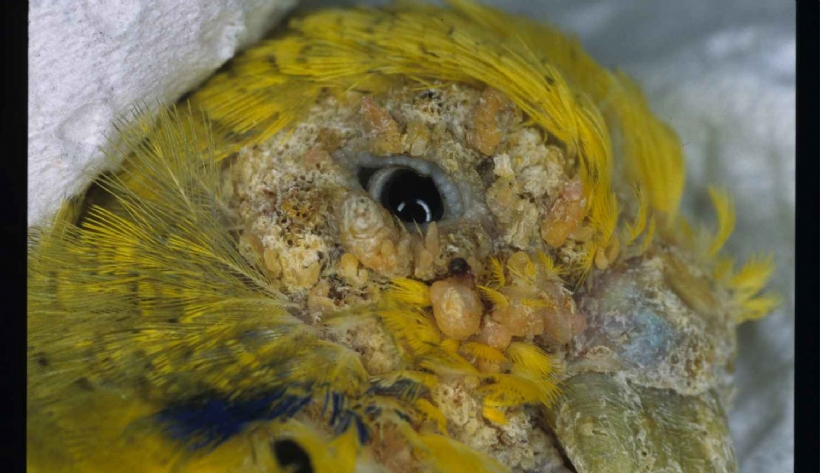 Mercredi 29 Mai 2024 Animaux de compagniePhoto n° 1 : Gale du bec et des paupières à Cnemidocoptes pilae chez une perruche ondulée (Melopsittacus undulatus).
