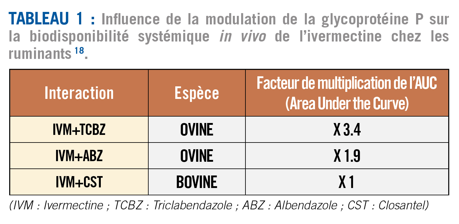 En particulier, de nombreuses études ont concerné les interactions entre la glycoprotéine P (P-gp) et les avermectines. L'ivermectine a ainsi une forte affinité pour la P-gp et présente la capacité de limiter voire de bloquer la capacité de la P-gp à être en compétition avec elle 18. Ces interactions débouchent sur une diminution de la sécrétion intestinale des lactones macrocycliques médiée par la P-gp, et ainsi on peut avoir une modulation de la disponibilité des molécules chez des animaux exposés : la co-administration de plusieurs molécules augmente alors la disponibilité de certaines molécules administrées comme en témoignent pour l'ivermectine des études rassemblées dans le tableau 1.