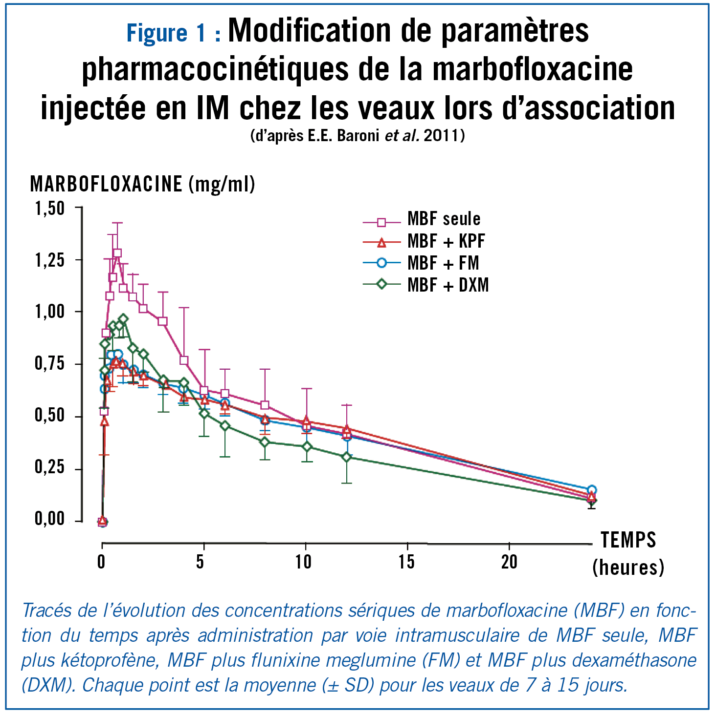 Par exemple, bien qu'actuellement il n'y ait cliniquement pas de preuve, il faut rester vigilant quant à la possible émergence d'antibiorésistance lors d'association d'un antibiotique avec des anti-inflammatoires AIS ou AINS chez les veaux. En effet, une étude récente a montré une modification significative de certains paramètres pharmacocinétiques de la marbofloxacine (Antibiotique d'importance critique) chez les veaux lors d'association comme en témoigne le graphique ci-dessous extrait de l'article de E.E. Baroni et al. 2011 (cf. fig. 1).
