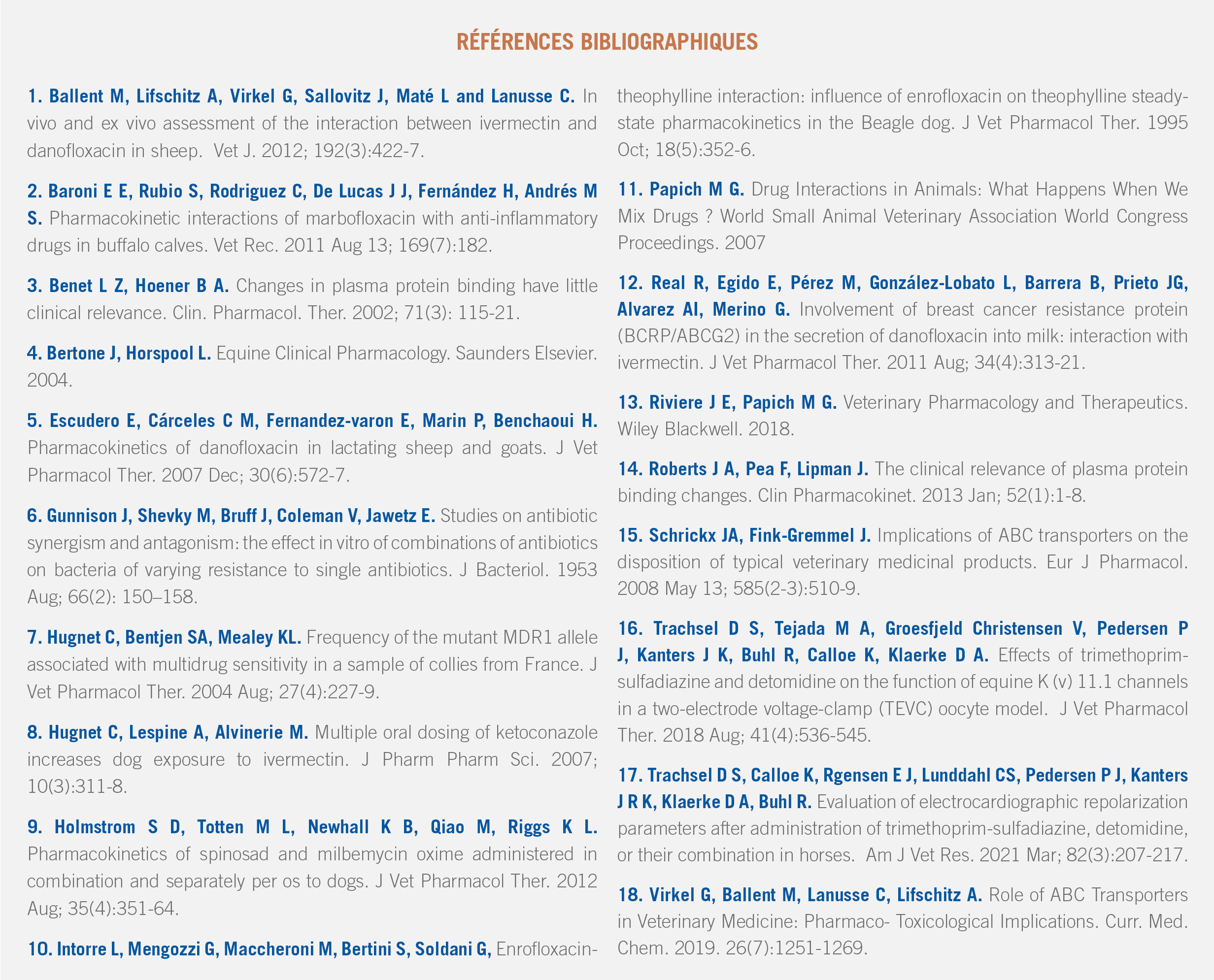 Les interactions médicamenteuses via les protéines plasmatiques sont sans répercussion clinique ou biologique significative en médecine vétérinaire avec les médicaments actuellement disponibles 3,14.