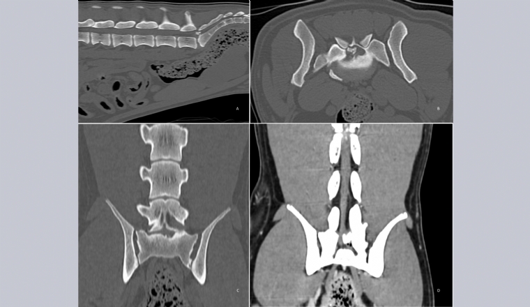 Mercredi 14 Juin 2023 Animaux de compagnieExamen tomodensitométrique : reconstructions sagittale, transverse et dorsale de la colonne lombosacrée (fenêtre osseuse (A, B et C) et tissus mous (D)).