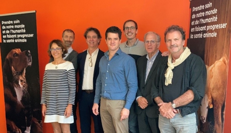 Mercredi 16 Fevrier 2022 EntrepriseLes membres du conseil scientifique Zoetis. De gauche à droite : Isabelle Chamouton (clinique vétérinaire 38,5 à Epinal), Luca Zilberstein (CHV Advetia), Hervé de Cidrac (président Zoetis France), Guillaume Ragetly (CHV Frégis), Antoine Fordin (responsable national vétérinaire Zoetis), Alain Eschalier (professeur émérite de pharmacologie médicale à l'université Clermont-Auvergne) et Thierry Poitte (clinique Ile de Ré, fondateur de CAPdouleur).