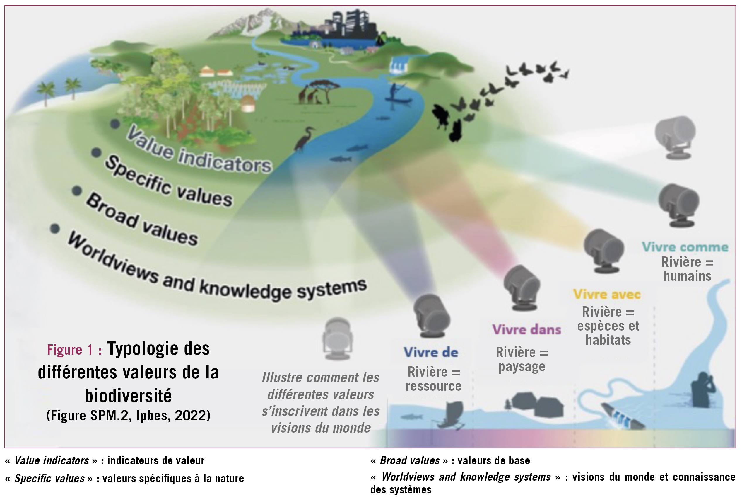 Plus d'une centaine d'États membres de la plate-forme intergouvernementale pour la biodiversité et les services écosystémiques (Ipbes), dont la France, se sont réunis à Bonn pour leur neuvième session plénière du 2 au 8 juillet 2022. Après l'adoption du résumé pour décideurs sur l'usage durable des espèces sauvages, qui a fait l'objet d'un article dans la Dépêche technique vétérinaire du mois de septembre 2022 (DT n° 197), intéressons-nous à présent à la seconde évaluation adoptée en 2022, sur les différentes valeurs de la biodiversité dont la typologie est résumée par la figure 1.