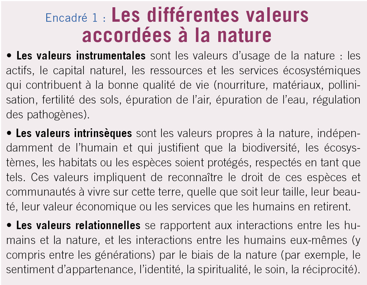 A côté de ces valeurs de base, les sociétés accordent des valeurs spécifiques à la nature (specific values). Elles sont généralement classées en trois catégories : les valeurs instrumentales, les valeurs intrinsèques et les valeurs relationnelles (cf. encadré 1).