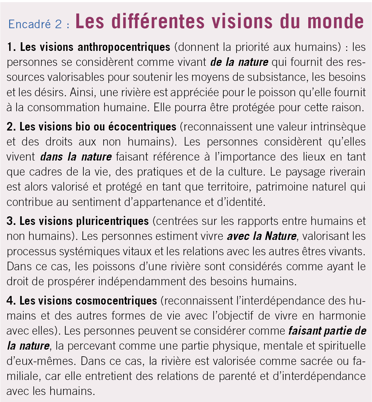 L'adhésion aux différentes valeurs sont façonnées par les visions du monde (worldviews) qui sont des prismes au travers desquels les personnes perçoivent, donnent du sens et agissent sur le monde. Les visions du monde ne sont pas mutuellement exclusives. Le contexte, les traditions, les croyances et les institutions peuvent renforcer l'une ou l'autre (cf. encadré 2).