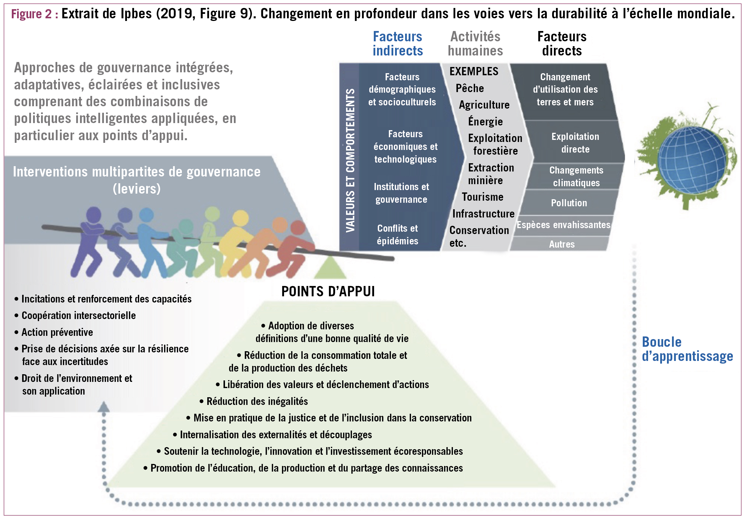 Si on s'intéresse à présent aux causes de ce déclin, les travaux de l'Ipbes nous rappellent que cinq facteurs directs de pressions expliquent l'érosion du vivant : le changement d'usage des sols, l'exploitation des ressources naturelles, le changement climatique, la pollution et la progression des espèces exotiques envahissantes. Ces facteurs directs de pression sont aggravés par de nombreux facteurs indirects comme la mauvaise gouvernance, la démographie galopante, les modes de consommation (surconsommation), la mondialisation anarchique et les réglementations inéquitables. Ces facteurs indirects aggravent les facteurs directs et sont en liens étroits avec les valeurs accordées à la biodiversité, la nature et le reste du vivant par les décideurs ou les consommateurs (cf. fig. 2).