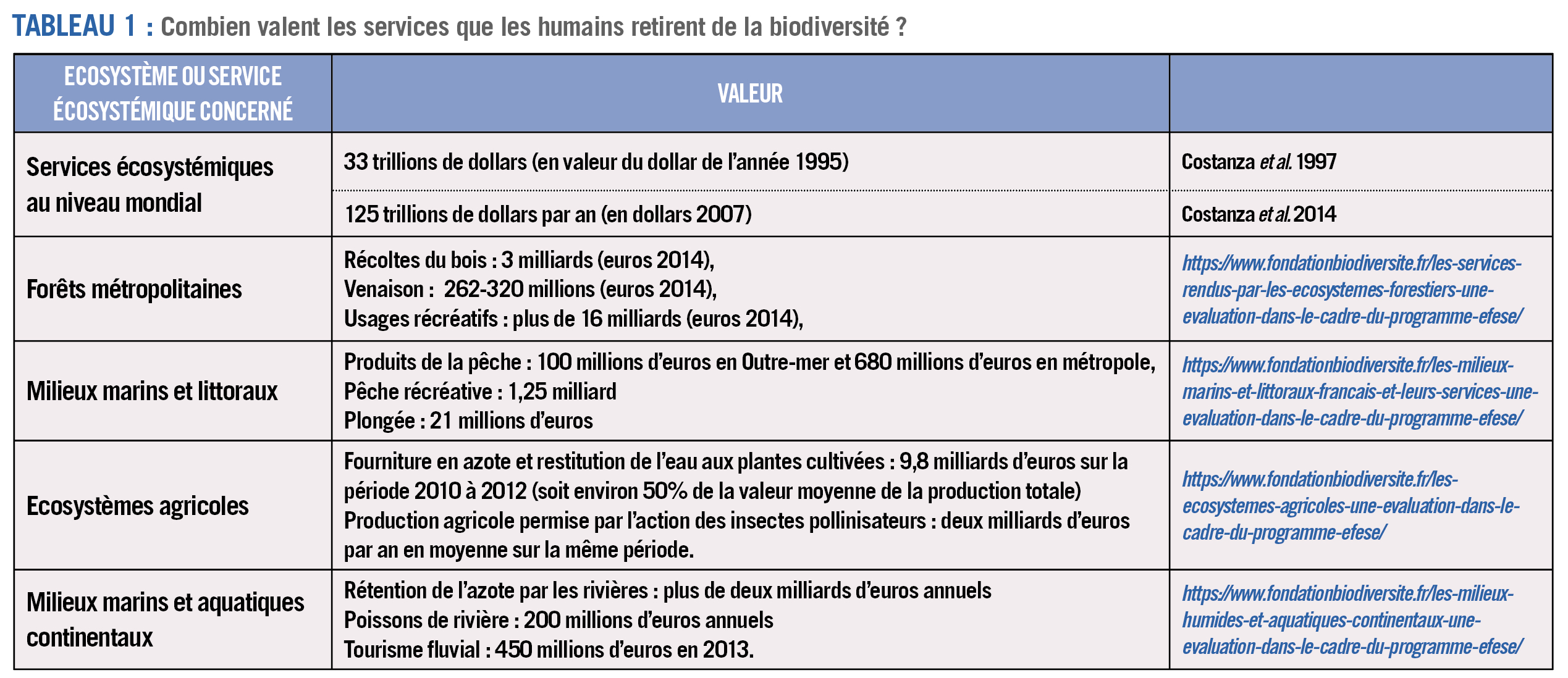 Cependant, combiner différents indicateurs est un challenge, car les valeurs ne sont directement comparables que lorsqu'elles sont mesurées en utilisant les mêmes métriques. C'est pourquoi pour l'instant, l'essentiels des travaux se concentrent sur l'évaluation monétaire des services écosystémiques (cf. tableau 1).