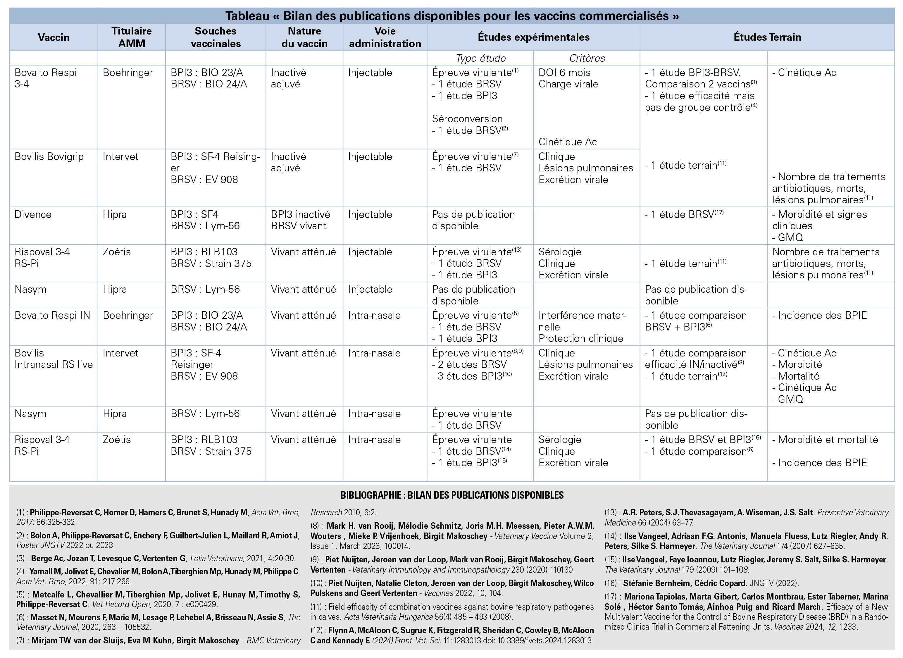 Pour les vaccins vivants atténués utilisés par voie intranasale, neuf publications dédiées à des études expérimentales sont disponibles : cinq pour le BRSV et quatre pour le virus BPI3. Par ailleurs, trois publications relatent des études de terrain et concernent les deux valences BRSV et BPI3.