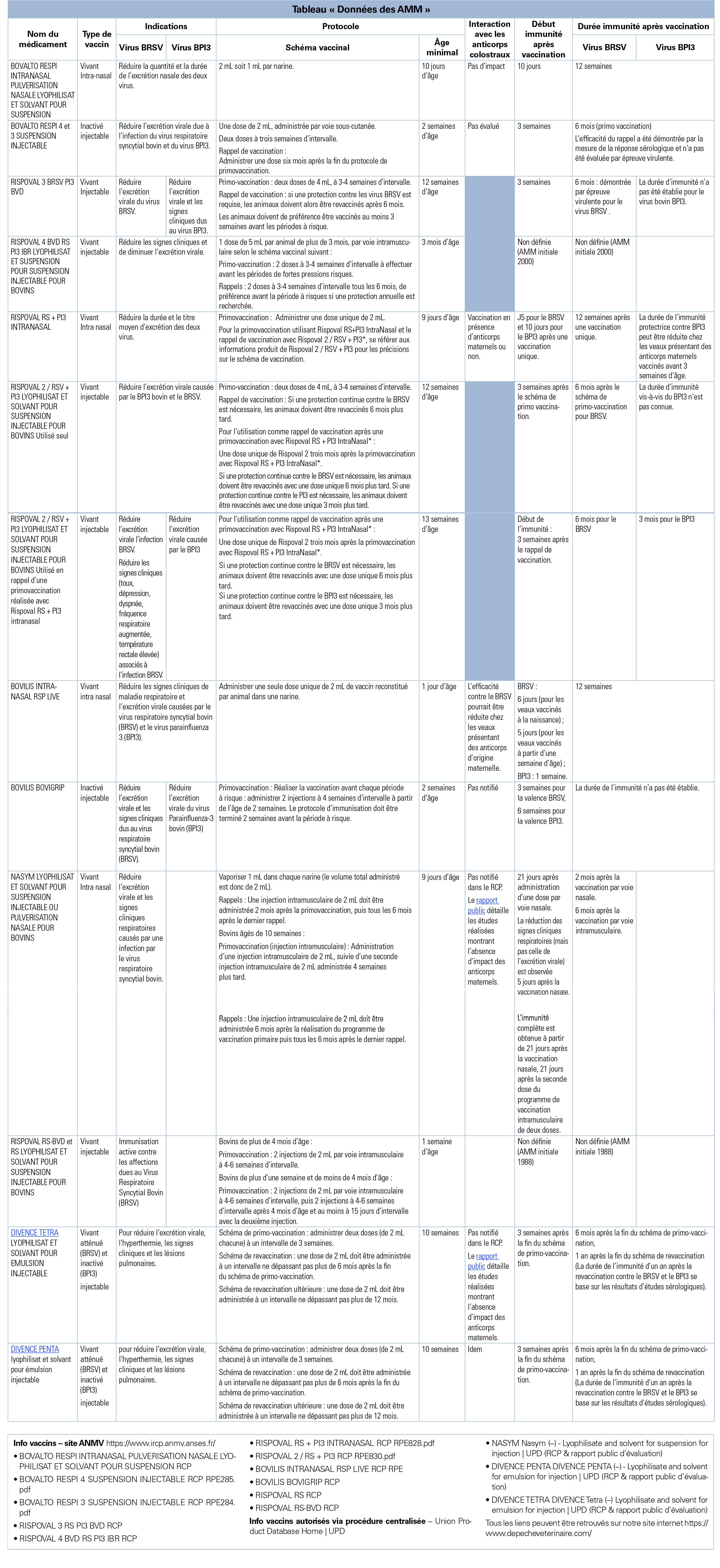 Un bilan des données disponibles sur les vaccins bovins contenant les valences BRSV ou BPI3 a été réalisé. Pour cela, les moteurs de recherche PubMed, Scopus et Google scholar ont été utilisés, avec les mots clefs suivants : « cattle / calf-calves/beef / vaccine / BPI3 / BRSV / live - attenuated or inactivated - killed / monovalent or multivalent / nom du laboratoire fabricant / nom commercial du vaccin / immunity / immune response / prevention ». Les éléments complémentaires ont été obtenus, sur les sites web UPD de l'EMA et iRCP de l'ANMV (RCP, RPE et EPAR) et de la Pharmacopée européenne (monographies fixant notamment les niveaux d'efficacité attendus).3,4