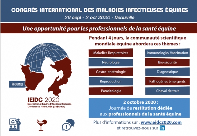 Le Congrès international des maladies infectieuses équines (IEIDC) se tiendra à Deauville, en Normandie, du 28 septembre au 2 octobre. Ces quatre jours permettront à la communauté scientifique internationale d'échanger sur un grand nombre de sujets autour de cette problématique de l'infectiologie. Notre confrère Romain Paillot et Stéphane Pronost, de Labéo (14), sont membres du comité international de l'IEIDC. Le dernier jour, 2 octobre, est une journée de restitution destinée aux professionnels de la santé équine. Les inscriptions seront ouvertes en ligne dès la fin de ce mois.