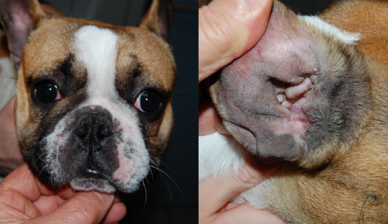 Chienne bouledogue français atteinte de dermatite atopique à l'âge d'un an.