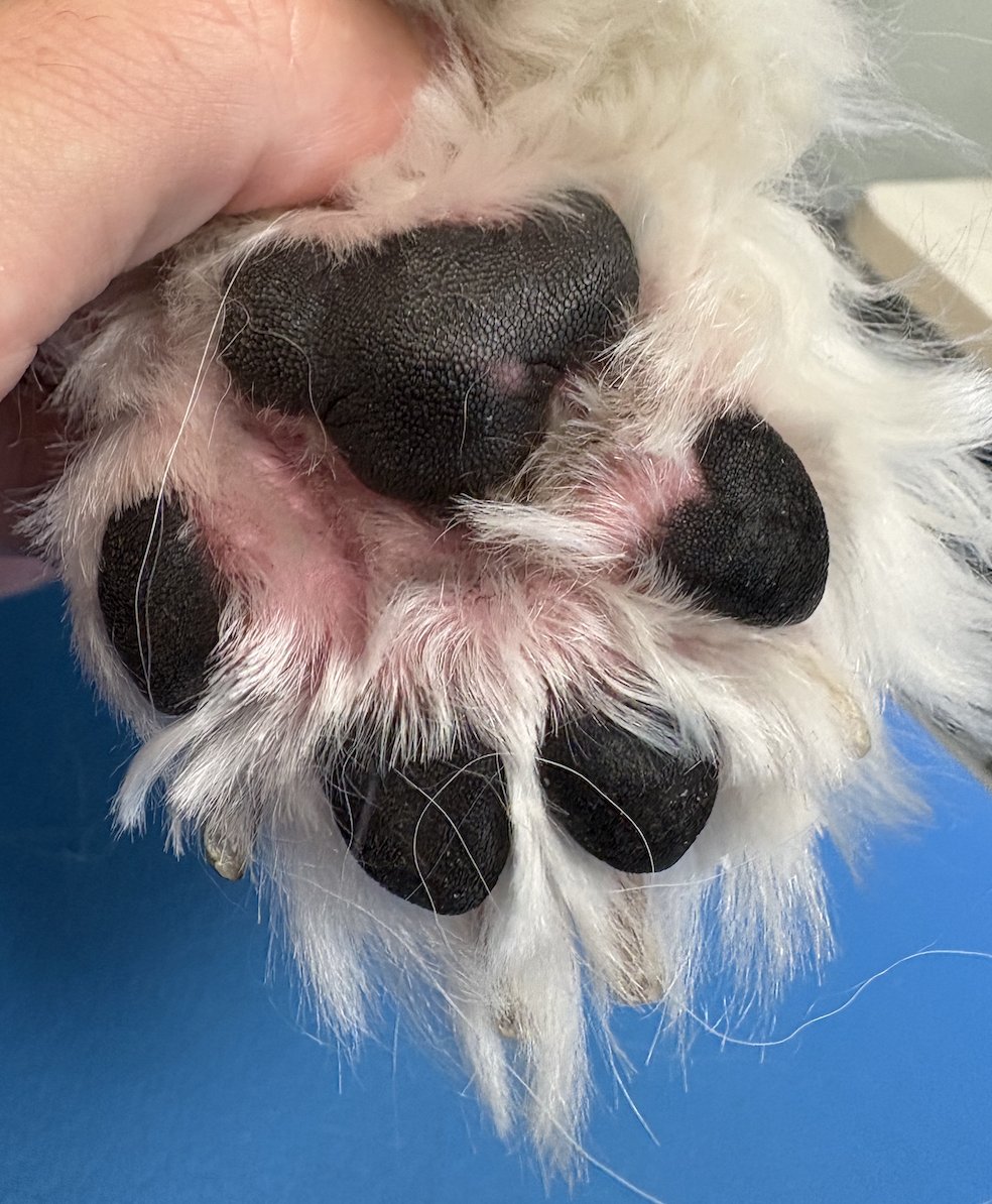 L'examen clinique met en évidence un érythème marqué, un début de lichénification et un épaississement cutané des babines, du museau et des faces dorsale et palmaire des pattes (photos n° 1, 2 et 3).