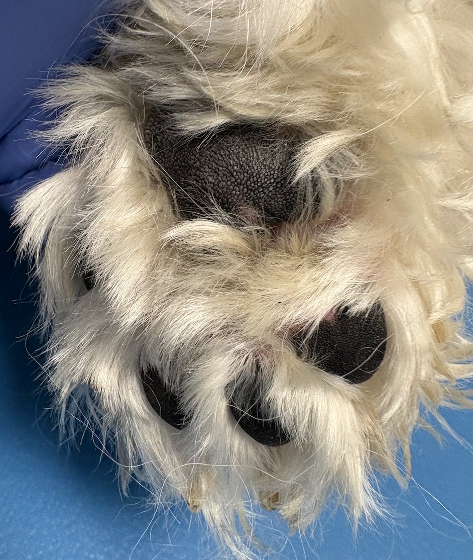 Photo n° 1 : Présentation clinique lors de la première consultation : érythème, début de lichénification et alopécie sur les babines, le museau, les doigts et les espaces interdigités.