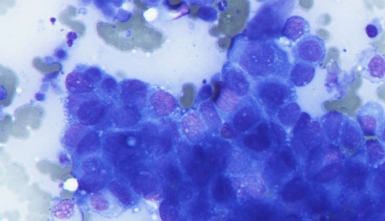 Mercredi 22 Septembre 2021 Animaux de compagnieCytoponction prostate (A et B) et frottis du culot de cytocentrifugation des urines (C) : La cytoponction de la prostate montre sans difficulté une prolifération épithéliale très atypique, relevant d'une prolifération papillaire, de grandes cellules à fort rapport nucléo-cytoplasmique, noyaux irréguliers, chromatine grossière, enrichie de multiples nucléoles. Les anomalies sont majeures, avec anisocytose, anisocaryose, plurinucléations, fréquentes mitoses, gigantisme. La population tumorale est retrouvée à l'examen des urines. Une infection bactérienne est associée.