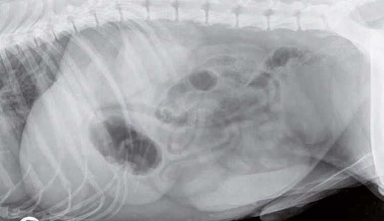 Radiographie abdominale de profil d'un chien souffrant de pancréatite aiguë : perte de contraste dans l'abdomen crânial droit, présence de gaz dans le duodénum.