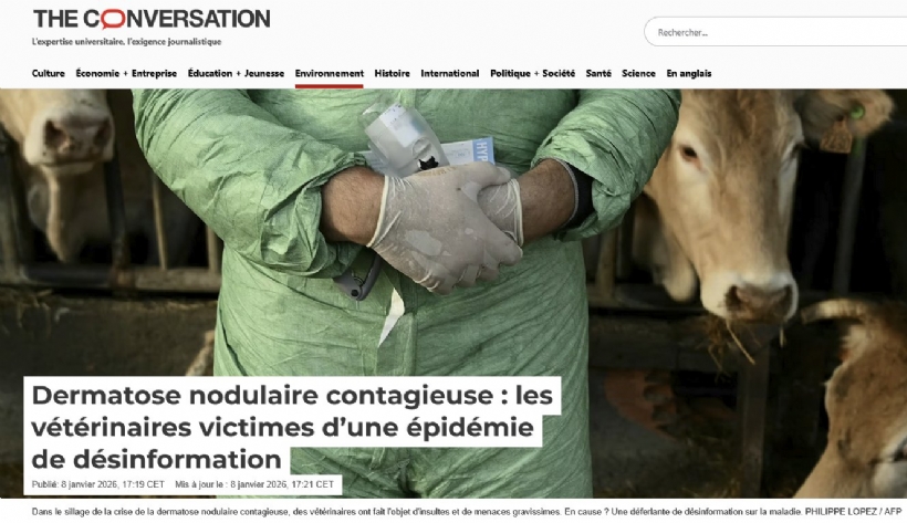 Dans la publication en ligne The Conversation du 8 janvier, le Pr Jeanne Brugère-Picoux (professeur honoraire de pathologie médicale du bétail à l'école vétérinaire d'Alfort, membre de l'Académie nationale de médecine et de l'Académie vétérinaire de France) et notre confrère Jean-Yves Gauchot, président de la Fédération des syndicats vétérinaires de France, cosignent un article intitulé « Dermatose nodulaire contagieuse : les vétérinaires victimes d'une épidémie de désinformation ». Face à « un déferlement de fakes news », contre-vérités scientifiques ou factuelles, les deux auteurs s'emploient à les démonter une par une. Ils soulignent que la revendication d'un abattage partiel lors de DNC « témoigne d'une méconnaissance de cette maladie ». Ils espèrent qu'il n'y aura plus de foyers de DNC à partir de mi-janvier 2026, « comme ce fut le cas dans les Savoie après la vaccination ». L'actualité sanitaire à cette date semble leur donner raison.