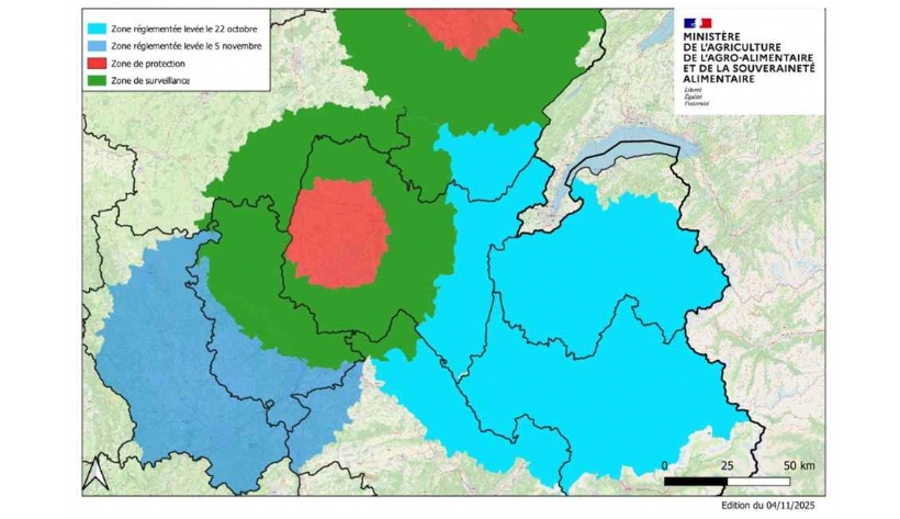 Selon la carte diffusée par le ministère, une partie de la zone (nord-est du département du Rhône) reste toutefois classée « zone de surveillance », en raison des foyers dans l'Ain situés à moins de 50 km.