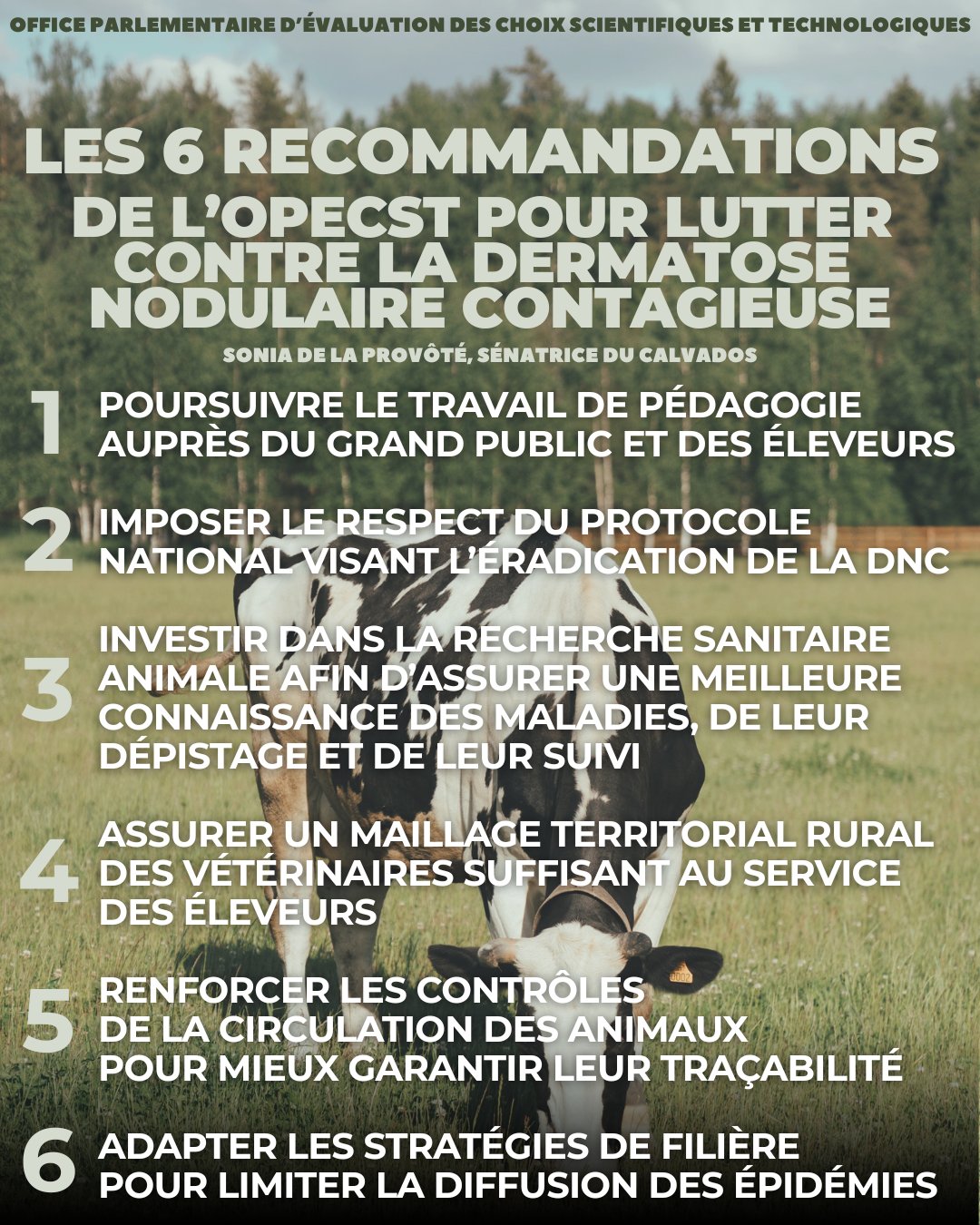 L'Office parlementaire propose en conclusion six recommandations : poursuivre la pédagogie auprès du public et des éleveurs, imposer le respect strict du protocole national (surveillance, abattage, interdiction des mouvements, vaccination), investir massivement dans la recherche sanitaire animale, assurer un maillage territorial vétérinaire suffisant, renforcer les contrôles de traçabilité des animaux et adapter les stratégies de filière pour réduire les mouvements d'animaux. ■