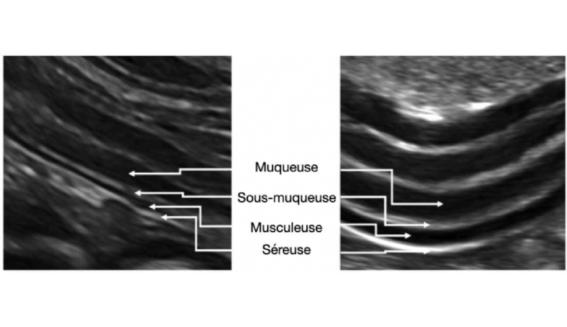 Mercredi 21 Janvier 2026 Animaux de compagniePhotos n° 1 : Aspect échographique d'une paroi intestinale saine (1A) et d'une paroi intestinale présentant un épaississement de la couche musculeuse (1B)(3).