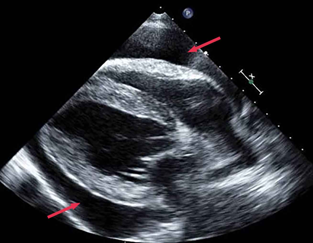 Une échographie POCUS (Point Of Care UltraSound) thoracique confirme la présence d'un épanchement péricardique (photo n° 2).