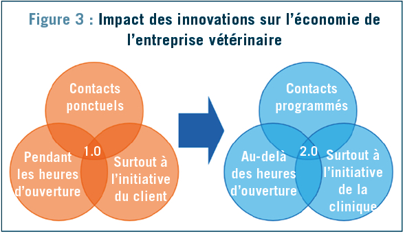 L'économie de l'entreprise vétérinaire est profondément modifiée si l'on combine les différents outils à la portée des praticiens pour enrichir l'offre (site marchand, plans de prévention, suivi des chroniques, prise de rendez-vous en ligne, télémédecine) : on réalise alors la transition d'un modèle traditionnel « 1.0 » vers un modèle contemporain « 2.0 » comme présenté dans la figure 3.