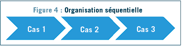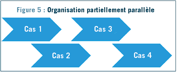 Dès que l'équipe commence à se structurer, il est possible de passer d'une d'organisation classique de la production d'actes, séquentielle (cf. fig. 4), à un système d'organisation partiellement parallèle (cf. fig. 5) où les différentes compétences se relaient sur chaque étape de l'acte réalisé. Si nous prenons l'exemple d'une chirurgie simple, l'ASV prépare l'animal, le chirurgien intervient pendant que l'ASV prépare le cas suivant puis le chirurgien repasse en asepsie et commence le cas suivant pendant que l'ASV intervient sur la phase finale du premier cas (nettoyage de l'animal, soins post-opératoires, suivi du réveil).