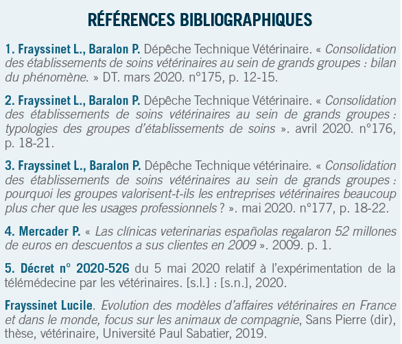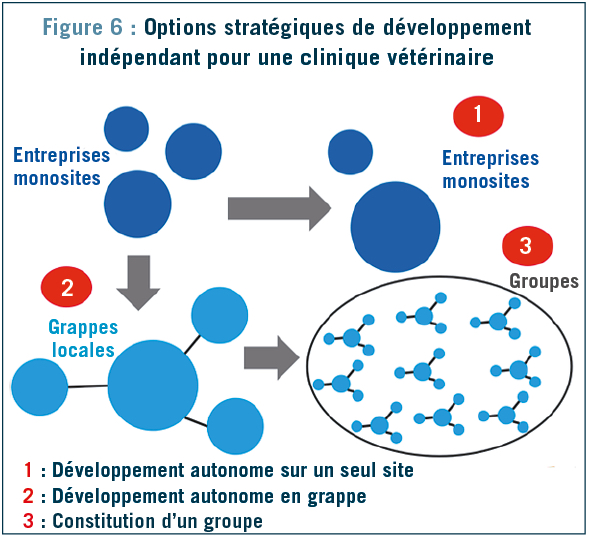 - Enfin dans de rares cas, (pastille 3 de la figure 6) plusieurs grappes locales et/ou des entreprises monosites de grande taille peuvent se rapprocher et fusionner en un groupe... indépendant, c'est-à-dire détenu à 100 % par des vétérinaires, avant d'évoluer, ou pas 2.