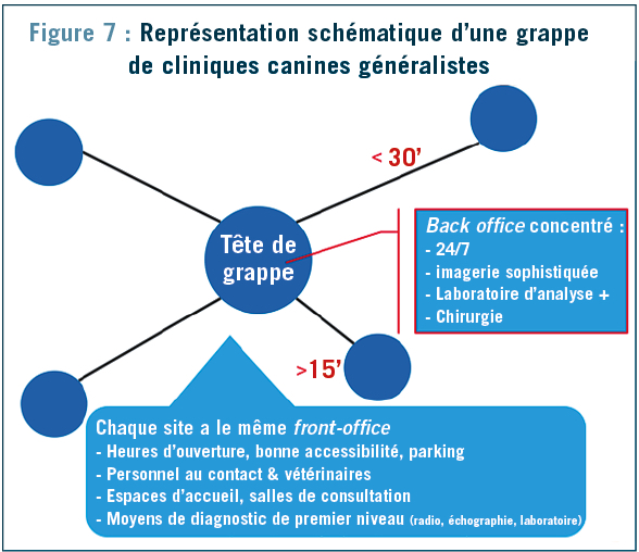 - Arrivées à un certain stade de développement - variable en fonction du lieu d'implantation - les entreprises peuvent évoluer en constituant une grappe locale (pastille 2 sur la figure 6). Ce modèle repose sur une clinique centrale et des cliniques périphériques, en aucun cas secondaires (cf. fig. 7). La création de valeur ne vient pas de la juxtaposition de structures, mais de leur organisation synergique, avec des fonctionnalités plus coûteuses proposées uniquement sur le site central, mais un niveau de front-office équivalent sur tous les sites (cf. fig. 7). L'augmentation du nombre d'établissements de soins au sein de la grappe permet, par une meilleure couverture du territoire, de recruter de nouveaux patients. La clinique centrale ajoute une capacité de croissance supplémentaire en offrant des services plus élaborés (on ne peut pas parler de services spécialisés) à l'ensemble des clients des différents sites de la grappe.