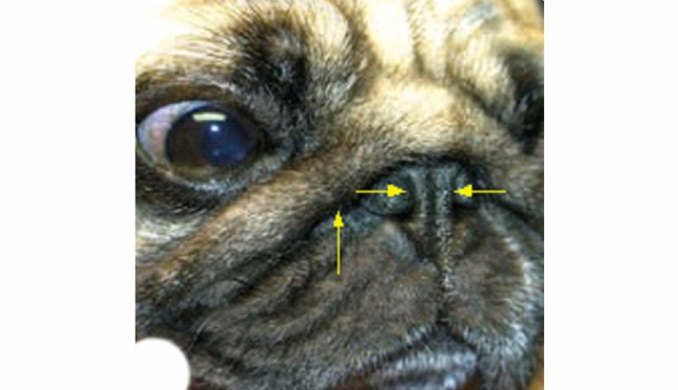 Mercredi 2 Juin 2021 Animaux de compagniePhoto n° 1A : Carlin adulte en 2010. Le pli nasal trop marqué est inducteur de dermatose du pli (A et B), la face est anormalement raccourcie et les narines sont sténosées (composantes du syndrome respiratoire obstructif, A et B), la fente palpébrale trop large (euryblépharon, C : flèche verte) induit une pigmentation cornéenne nasale (flèche jaune) associée à un entropion médial inférieur (flèche bleue).