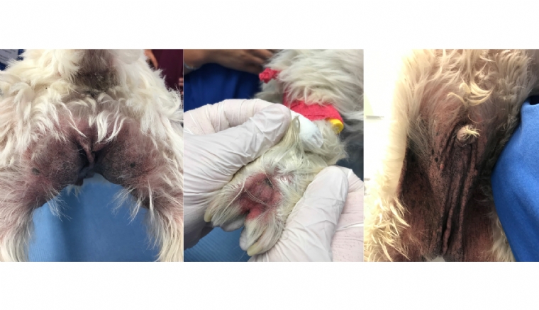 La pullulation de ces agents s'accompagne d'une séborrhée, d'une forte odeur et, dans les formes plus chroniques, d'une hyperpigmentation et d'une lichénification.