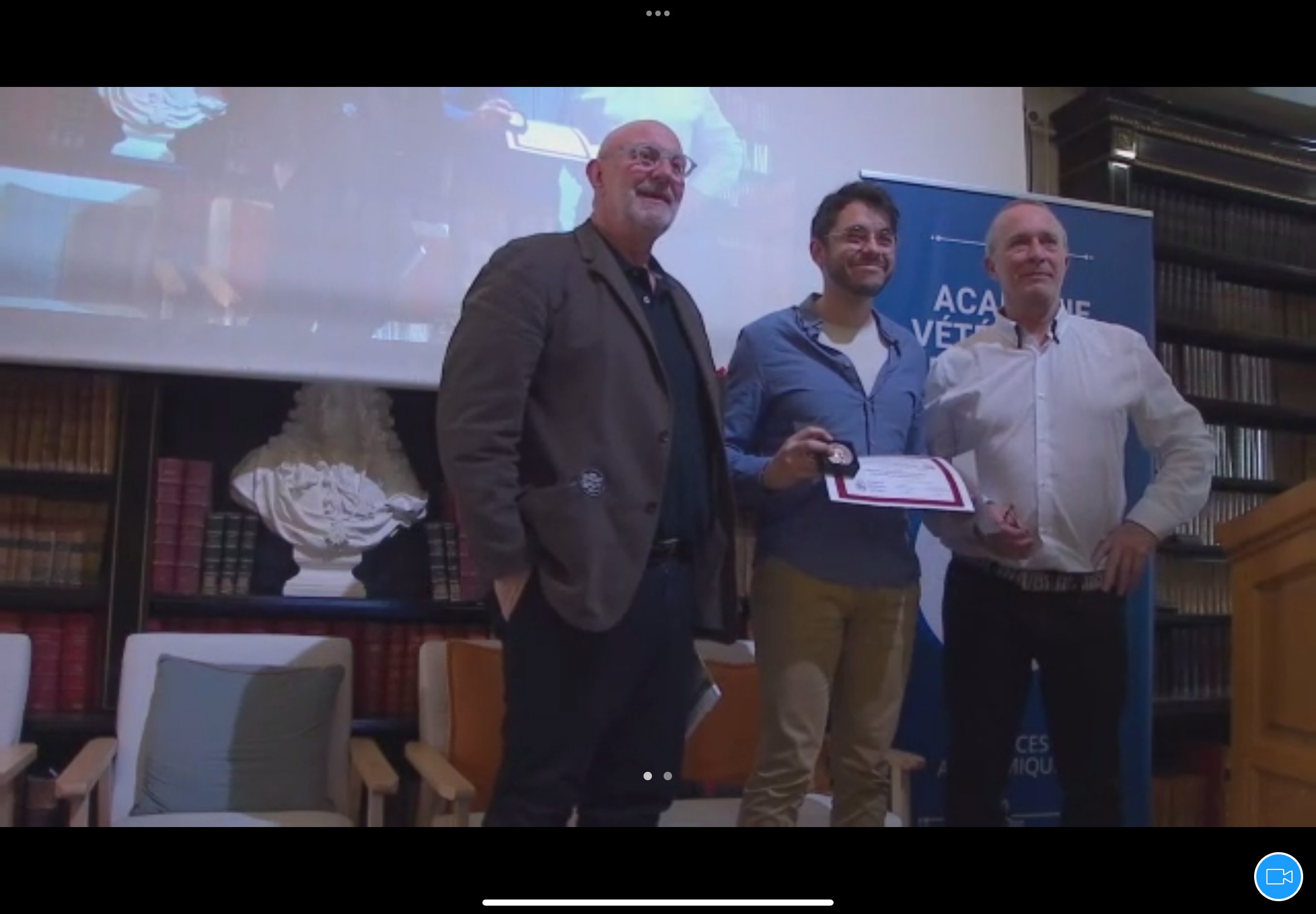 L'Académie vétérinaire de France a remis ses prix de thèse d'exercice et son prix de thèse d'université à de jeunes vétérinaires lors de la séance académique des lauréats, le 3 avril, à Paris et retransmise en distanciel. Nos confrères Eric Guaguère (président de la commission des prix de l'Académie vétérinaire) et Pierre Sai en étaient les coordinateurs.