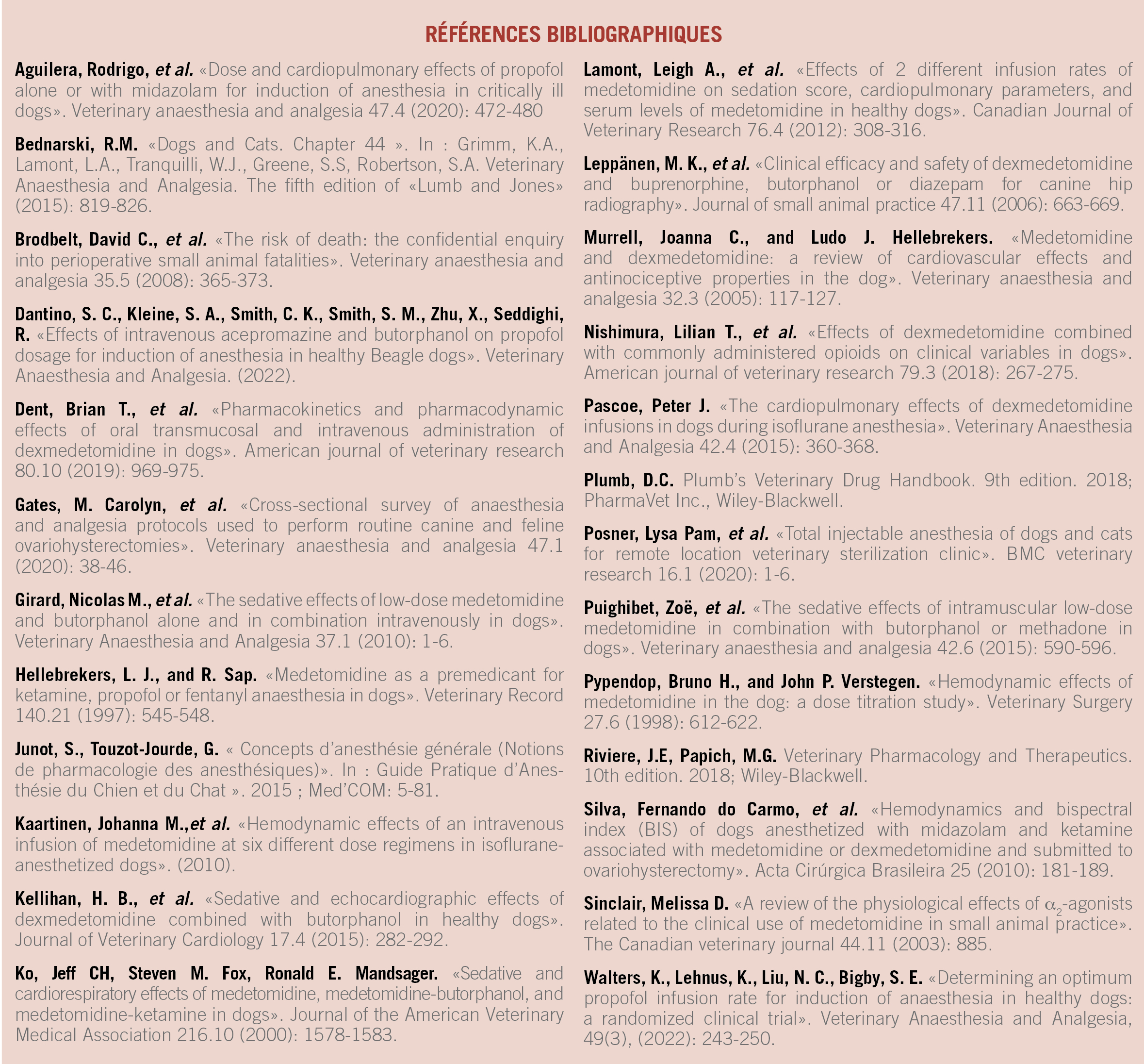 Par ailleurs, tous les médicaments ne sont pas ici présentés et le lecteur est renvoyé à la bibliographie pour l'utilisation notamment de l'acépromazine, du fentanyl, de l'alfaxalone et des anti-inflammatoires, qui s'inscrivent dans le même concept d'anesthésie balancée.